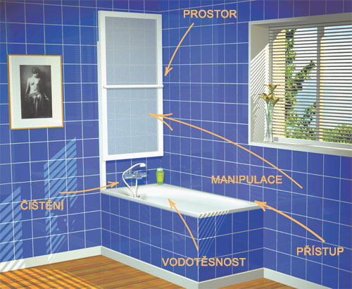 Patentovaný pneumatický sytém vanové zástěny umožňuje zvednutí a sklopení na stěnu nad baterii.